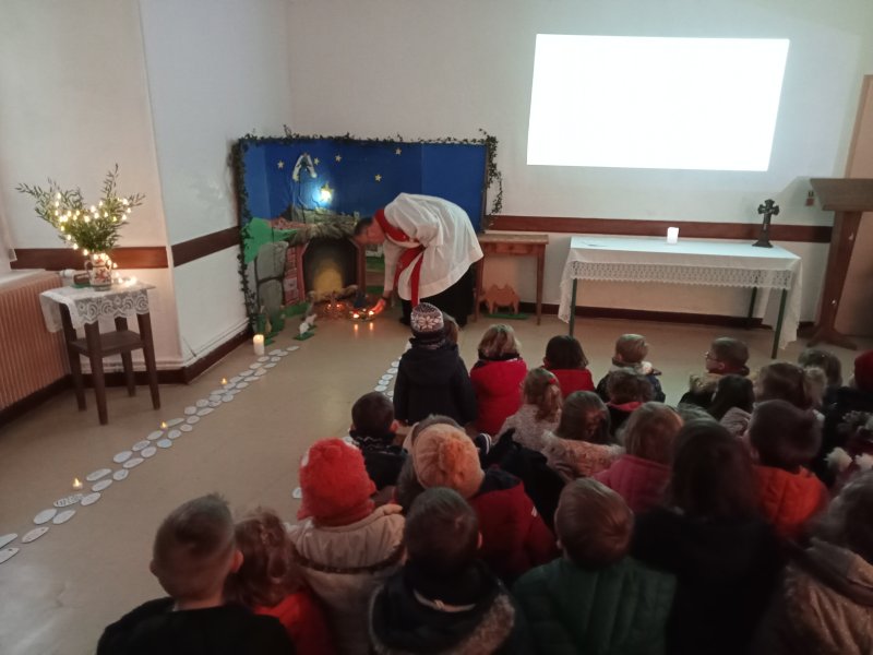 Jeudi après-midi 14 décembre, tous les enfants de maternelle se sont réunis  à la salle de la cure près de l’église, pour  participer à la célébration de Noël.