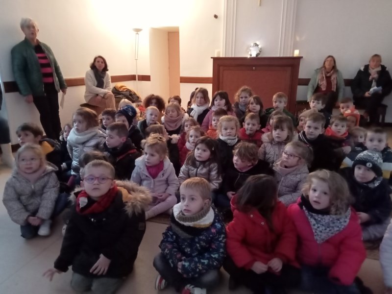 Jeudi après-midi 14 décembre, tous les enfants de maternelle se sont réunis  à la salle de la cure près de l’église, pour  participer à la célébration de Noël.
