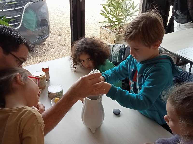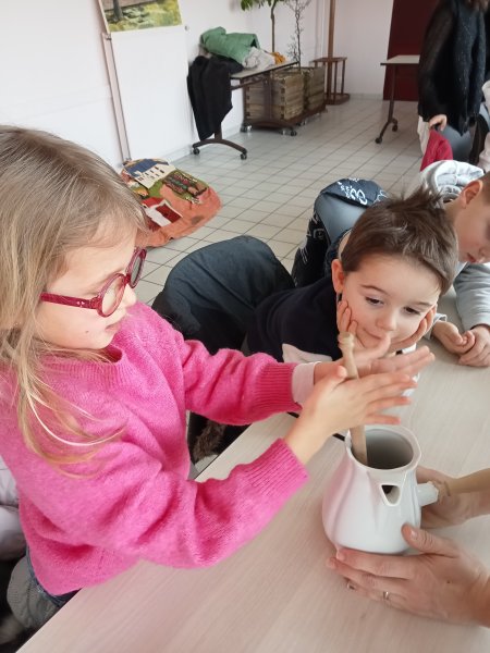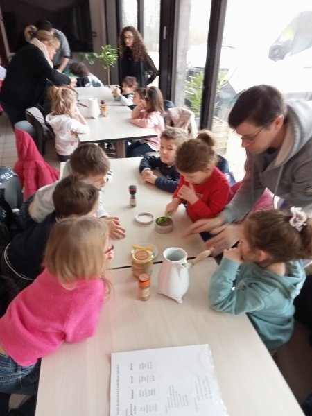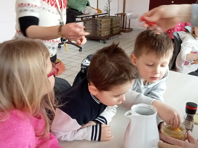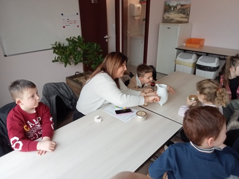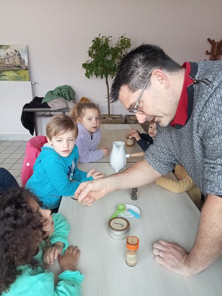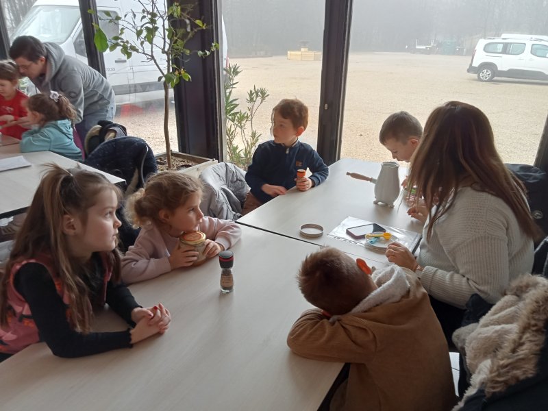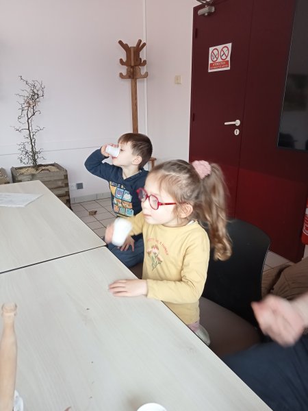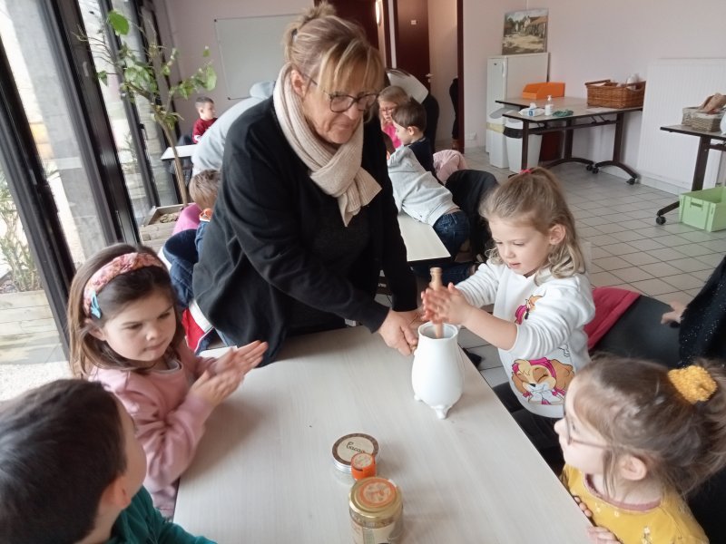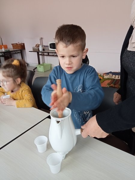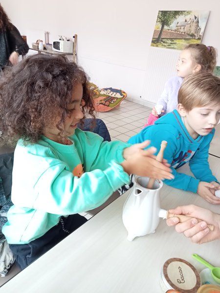 -la recette du chocolat chaud : Angéline l’animatrice nous a raconté une histoire sur le tapis à histoire puis nous avons réalisé la recette du chocolat chaud à l’ancienne. Nous avons mis les ingrédients dans la chocolatière: du lait chaud, du chocolat, du miel, de la cannelle, de la vanille et un peu de poivre. Nous avons mélangé avec le moussoir et nous avons gouté le chocolat. C’était délicieux !