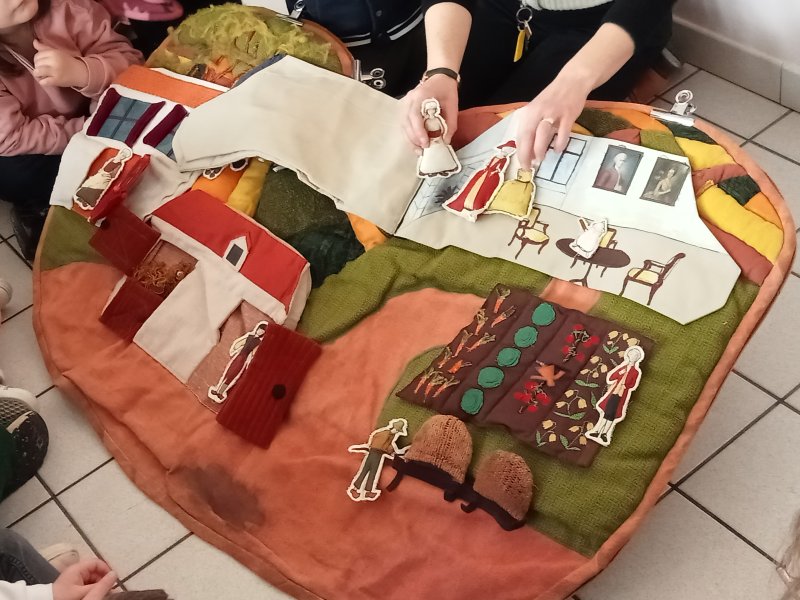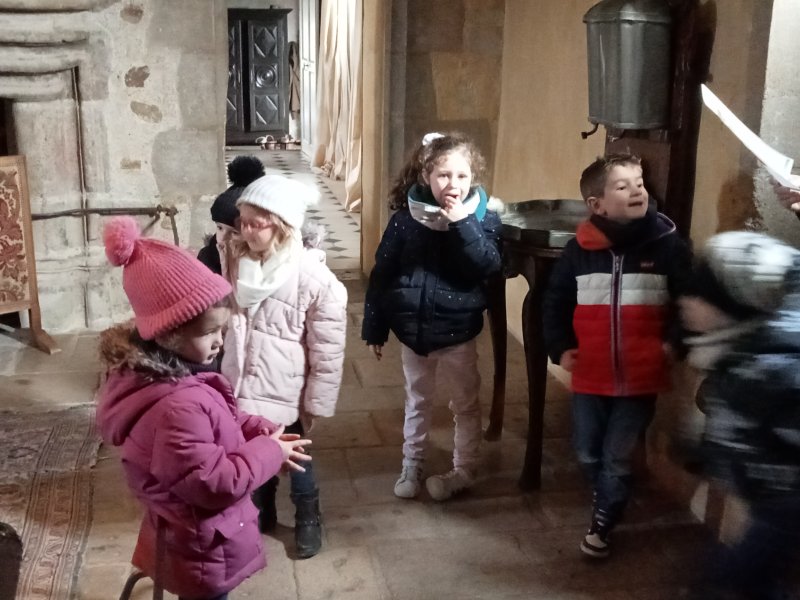 -la découverte du logis : A l’intérieur, nous avons observé les objets dans le SALON et nous avons senti différentes odeurs dans la CUISINE, et à l’extérieur, nous avons écouté les bruits dans la COUR D’HONNEUR et nous avons touché les plumes et les poils d’animaux DANS LA BASSE-COUR.