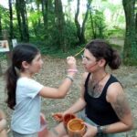Nous avons percé avec du silex ou poli les objets pour les enfiler. Ensuite, Fleur nous a peint le visage avec des ocres rouges ou jaunes.