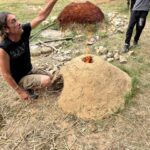 Ensuite, Jo nous a montré comment faire du feu mais cette fois avec des pierres (silex + marcassite). Il a ainsi allumé un four préhistorique (pas le nôtre qui sera sec dans quelques semaines).